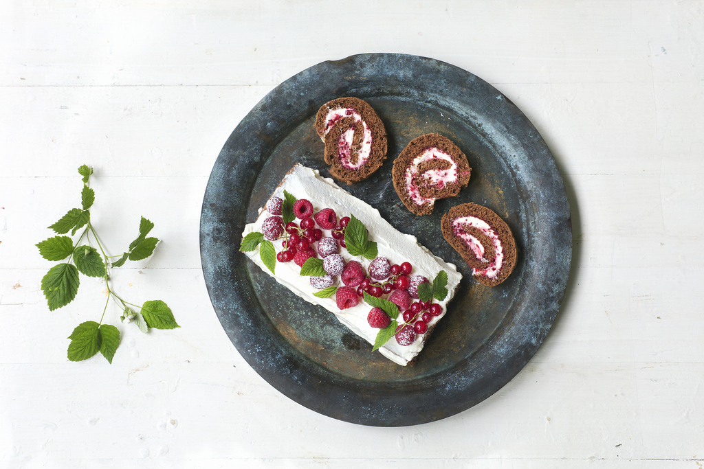 Rullekake med sjokolade, krem, rips og bringebær - oppskrift laget av Vigdis Solberg